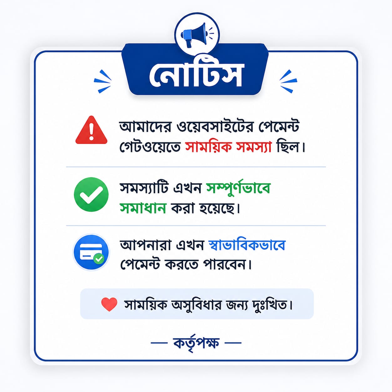 আমাদের ওয়েবসাইটের পেমেন্ট গেটওয়ে-তে সাময়িক সমস্যা ছিল।সমস্যাটি এখন সম্পূর্ণভাবে সমাধান করা হয়েছে।আপনারা এখন স্বাভাবিকভাবে পেমেন্ট করতে পারবেন।সাময়িক অসুবিধার জন্য দুঃখিত।— কর্তৃপক্ষ